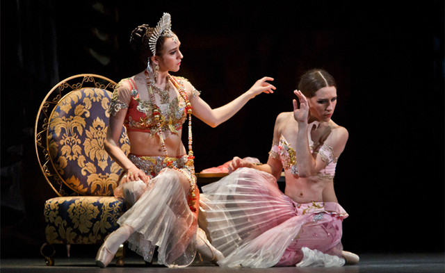 古典芭蕾舞剧《舞姬》改编自印度著名诗人迦梨陀娑的七幕诗剧《沙恭达罗》,最初由被誉为“古典芭蕾之父”的著名编导马里乌斯·彼季帕创排完成,并在1877年进行首演。该剧讲述了在遥远的古印度,尊贵的武士索罗尔与美丽的舞姬妮基娅不顾门第身份的差异在圣火前许下海誓山盟,但国王为嘉赏索罗尔的勇敢而将公主许配给他。被美色和权力冲昏了头的索罗尔答应了国王的婚约,妮基娅心碎不已。就在索罗尔犹疑之际,心生妒忌的公主却用毒蛇害死了美丽善良的妮基娅,深受打击的索罗尔只得在吸食鸦片中麻痹自我,在幻境中追寻爱人的踪迹。而幻境破灭后,索罗尔还是被迫来到神殿与公主完婚,但神灵终被这场悲剧激怒,掀起一场强烈的地震,惩罚了罪恶,毁灭了一切。